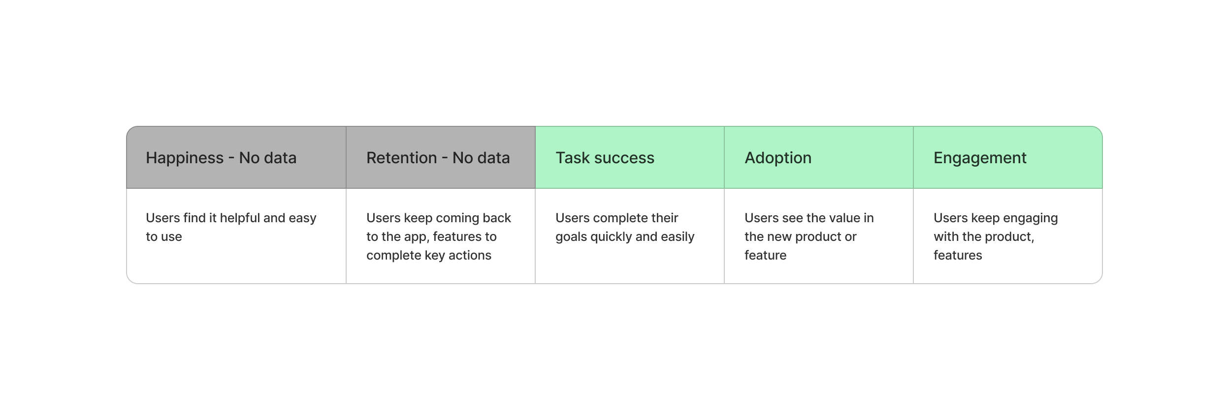 Following that, I implemented the HEART framework for analysing each feature that we had on the current website & looked at the overall product metrics based on: adoption, task success & engagement.
